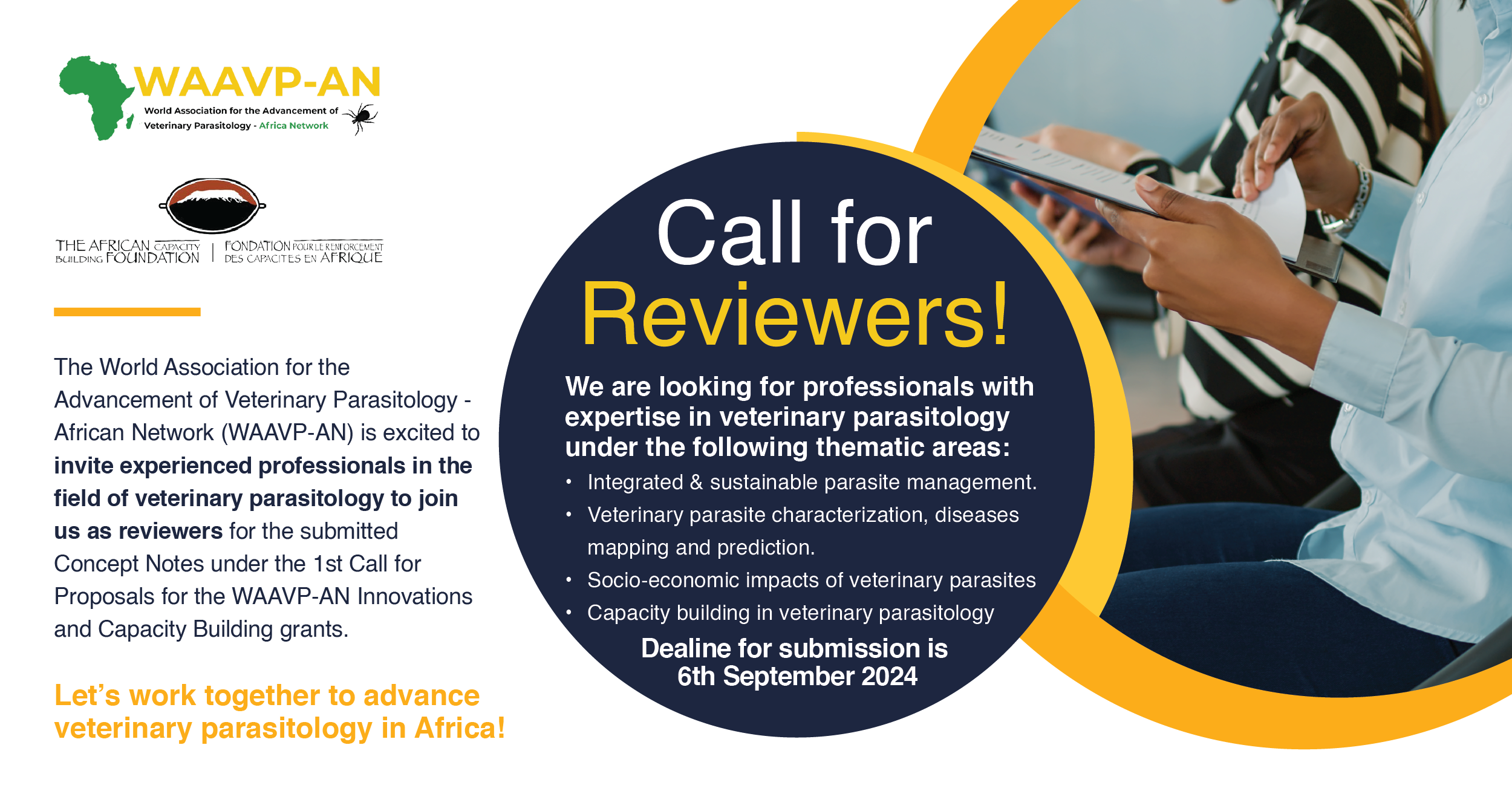 The World Association for the Advancement of Veterinary Parasitology – African Network (WAAVP-AN) is excited to invite experienced professionals in the field of veterinary parasitology to join us as reviewers for the submitted Concept Notes under the 1st Call for Proposals for the WAAVP-AN Innovations and Capacity Building grants.
